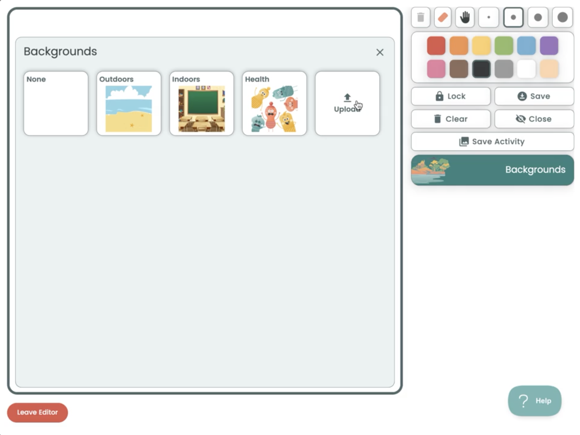Click on "Backgrounds", then "Upload" in the Backgrounds tray