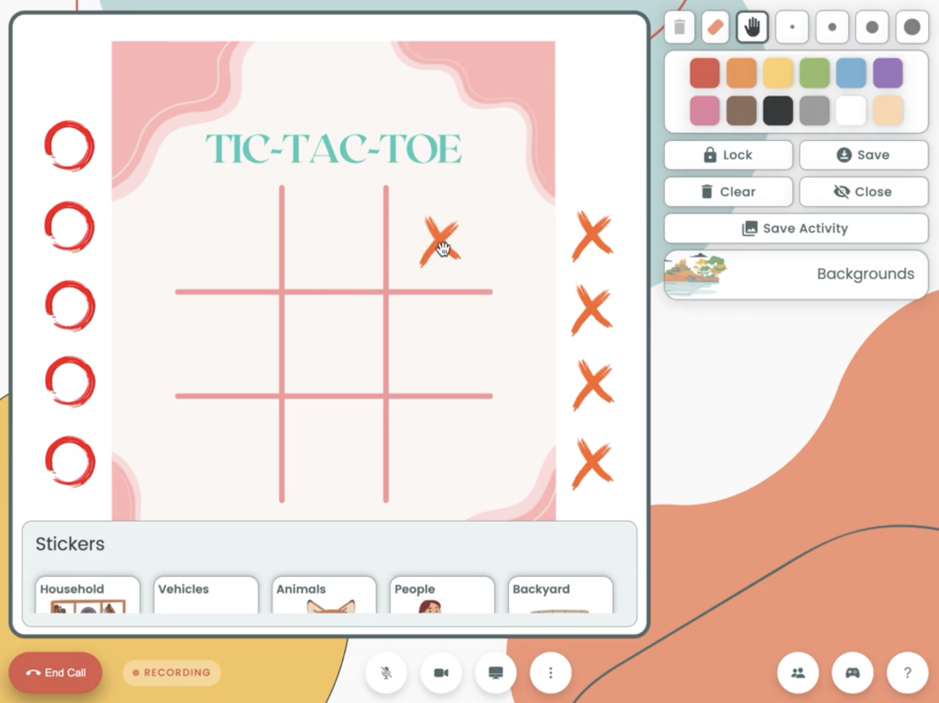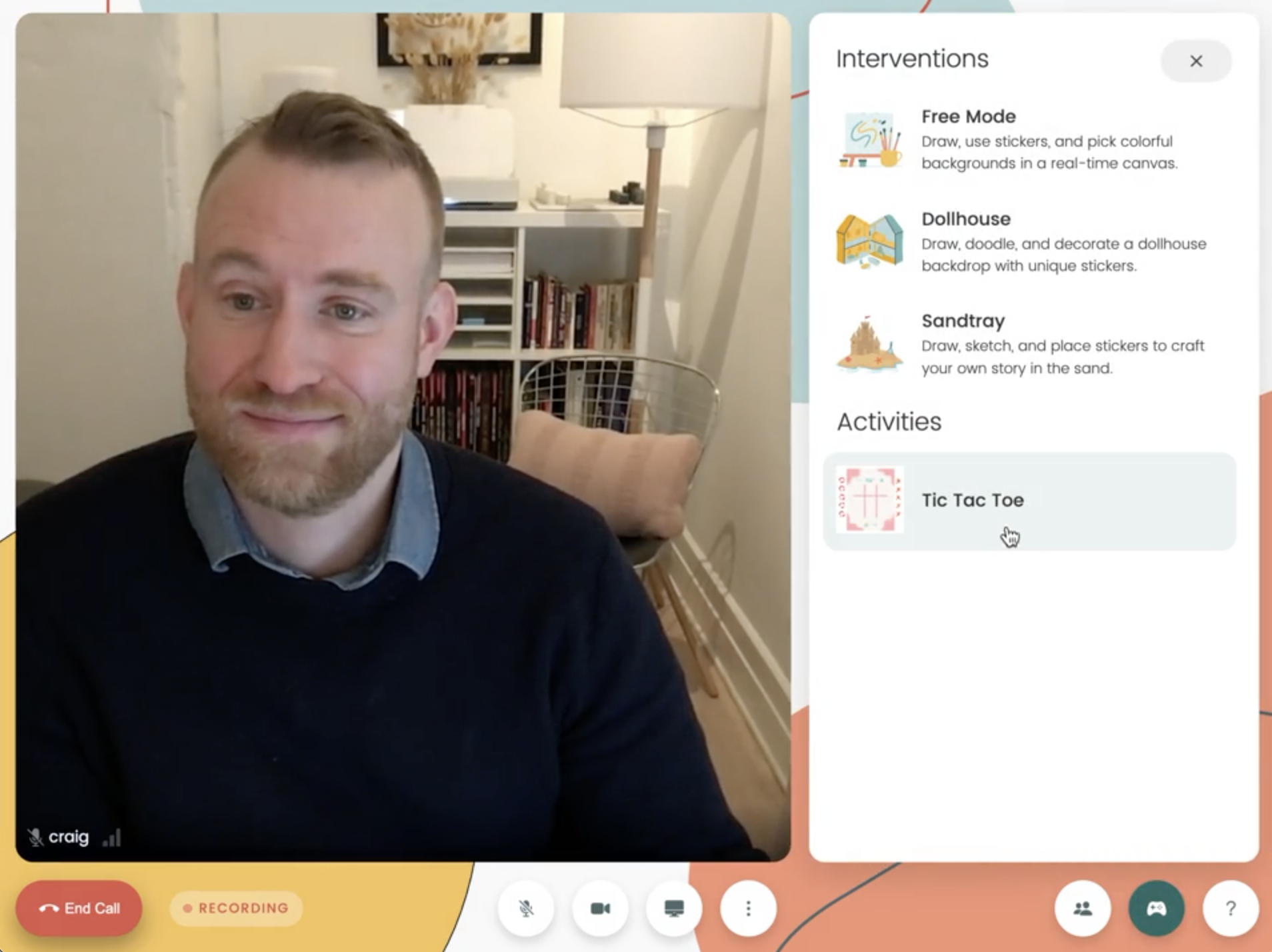 Easily create a template of your own worksheets and interventions, or select from a curated list by Kismet, and quickly load them in your sessions. Being able to upload your own activities into the canvas opens up the possibilities for session Telehealth interventions with clients.